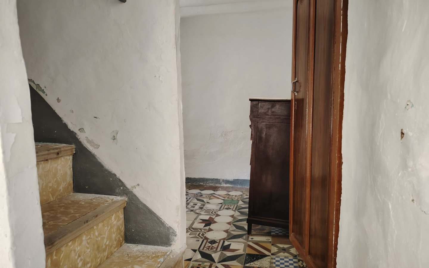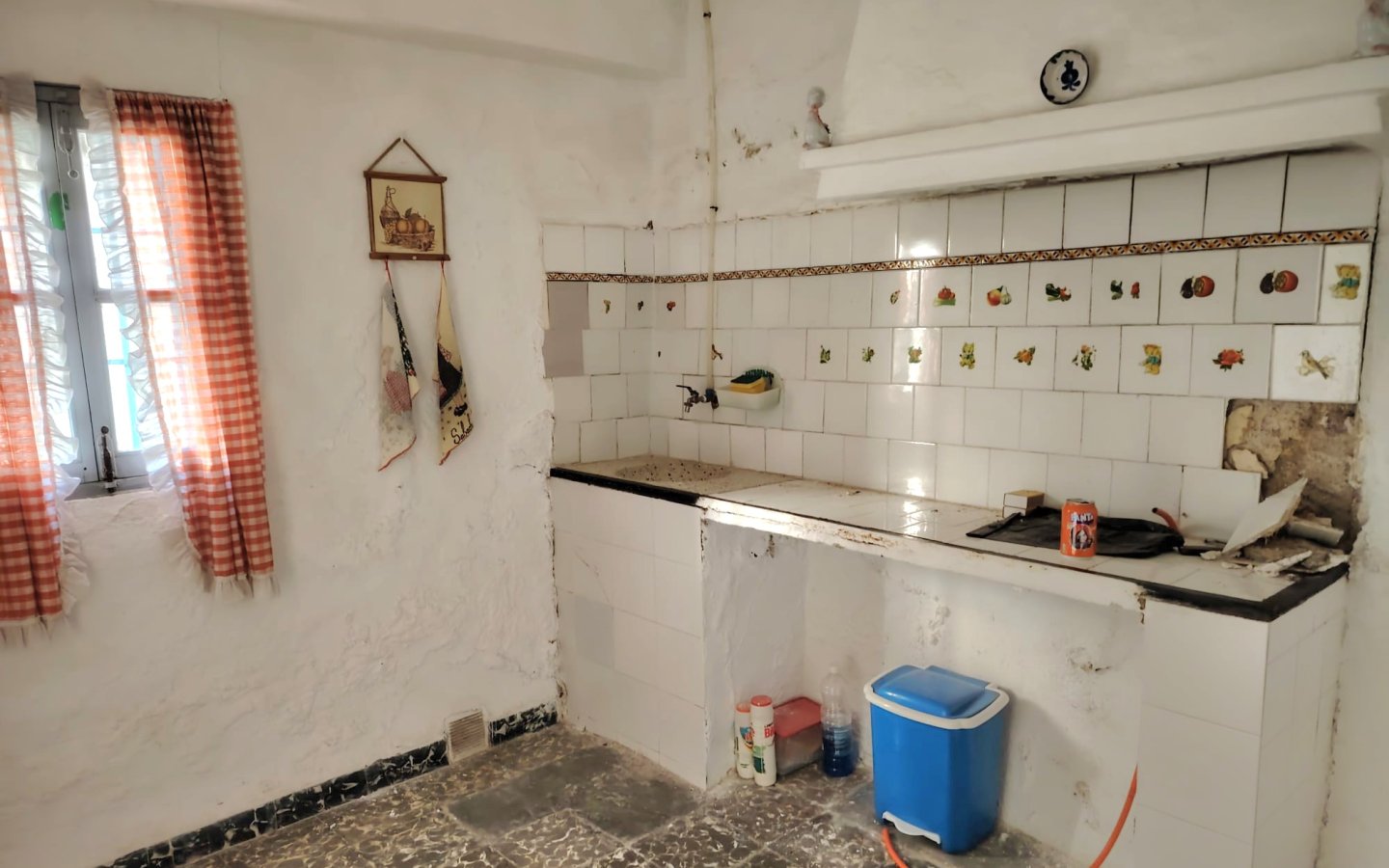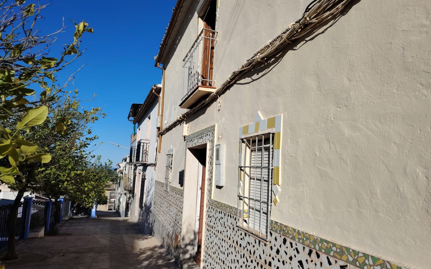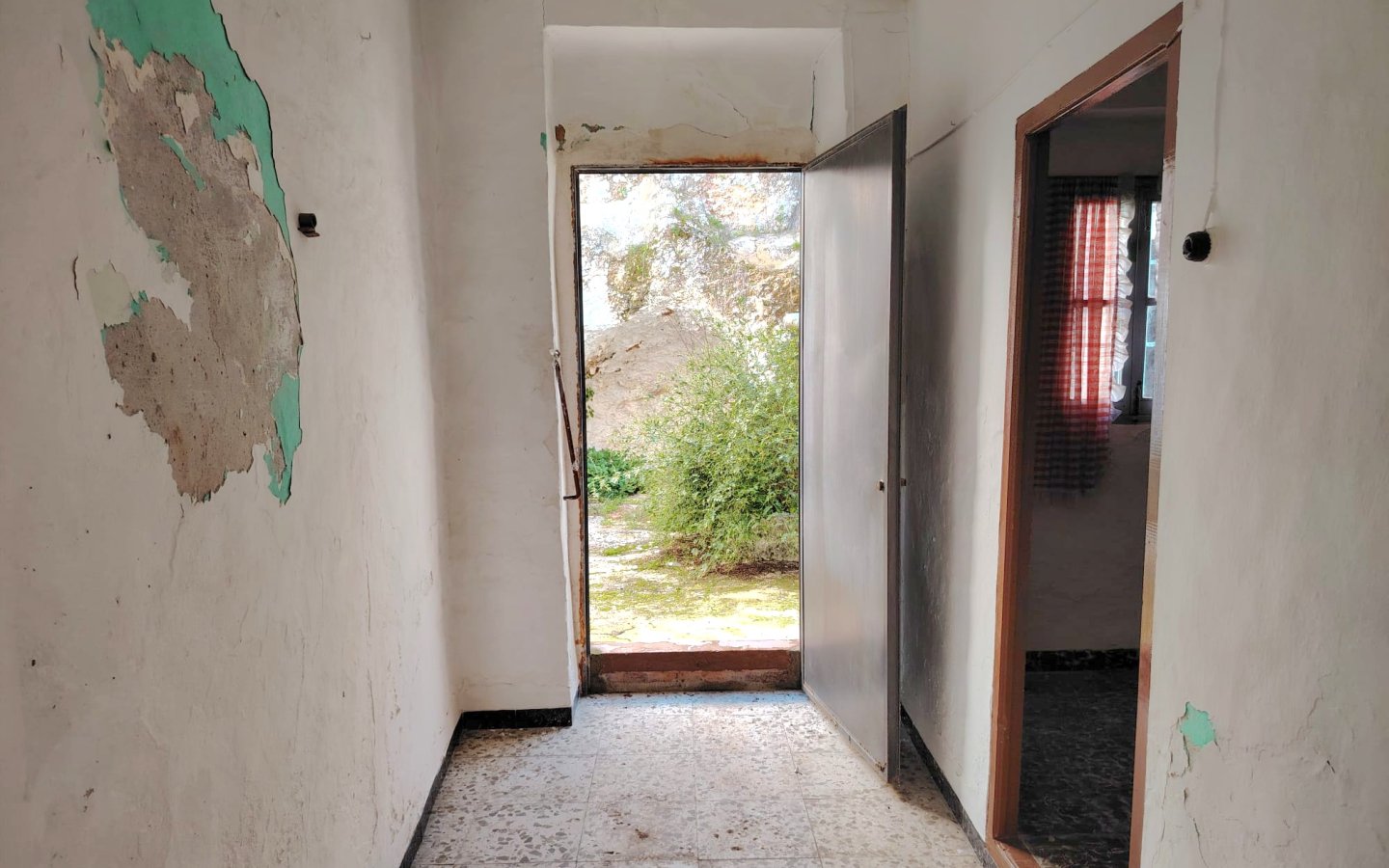 Located in a raised position with access to the side to the raised garden area which could easily be incorporated from the ground floor patio. To the front of the property there is a lovely paved area filled with orange trees which is owned and maintained by the local Town hall. On entering the houses there is a large front facing lounge with some original features including an under stair storage room. To the rear of this room a corridor takes you a large family kitchen in need of updating and modernizing with a fireplace. There is access from the corridor out to the ground floor patio this is a great size and has a quirky rock formation which when painted could be quite a feature. There is a large cave-like storage room in this area too and you can see the raised garden area which could also be easily incorporated into the patio as a raised sun terrace/garden. There is also an outside bathroom in the area again which needs updating however water and waste are there.