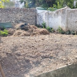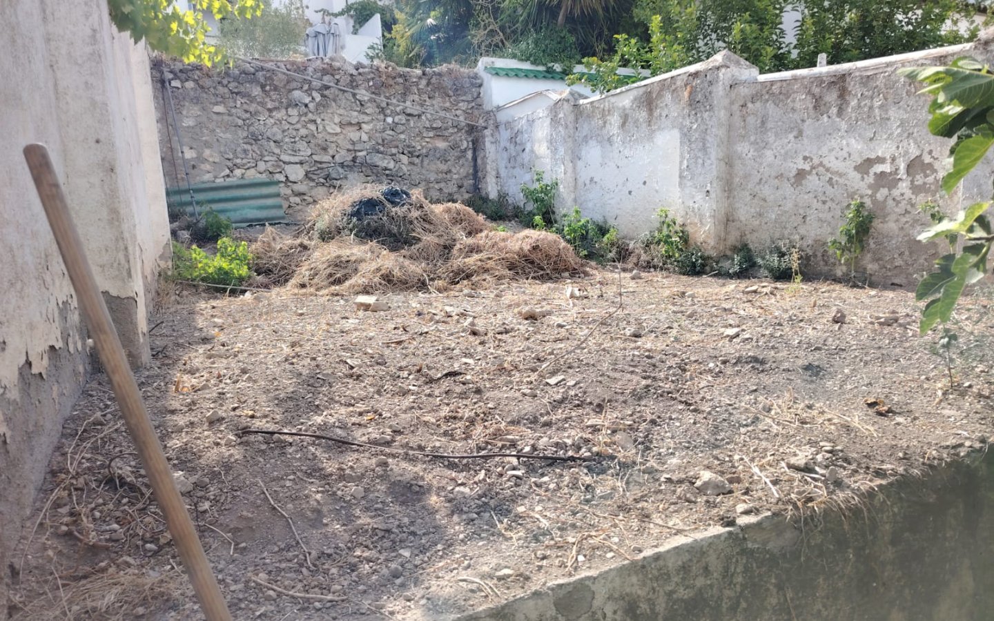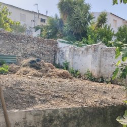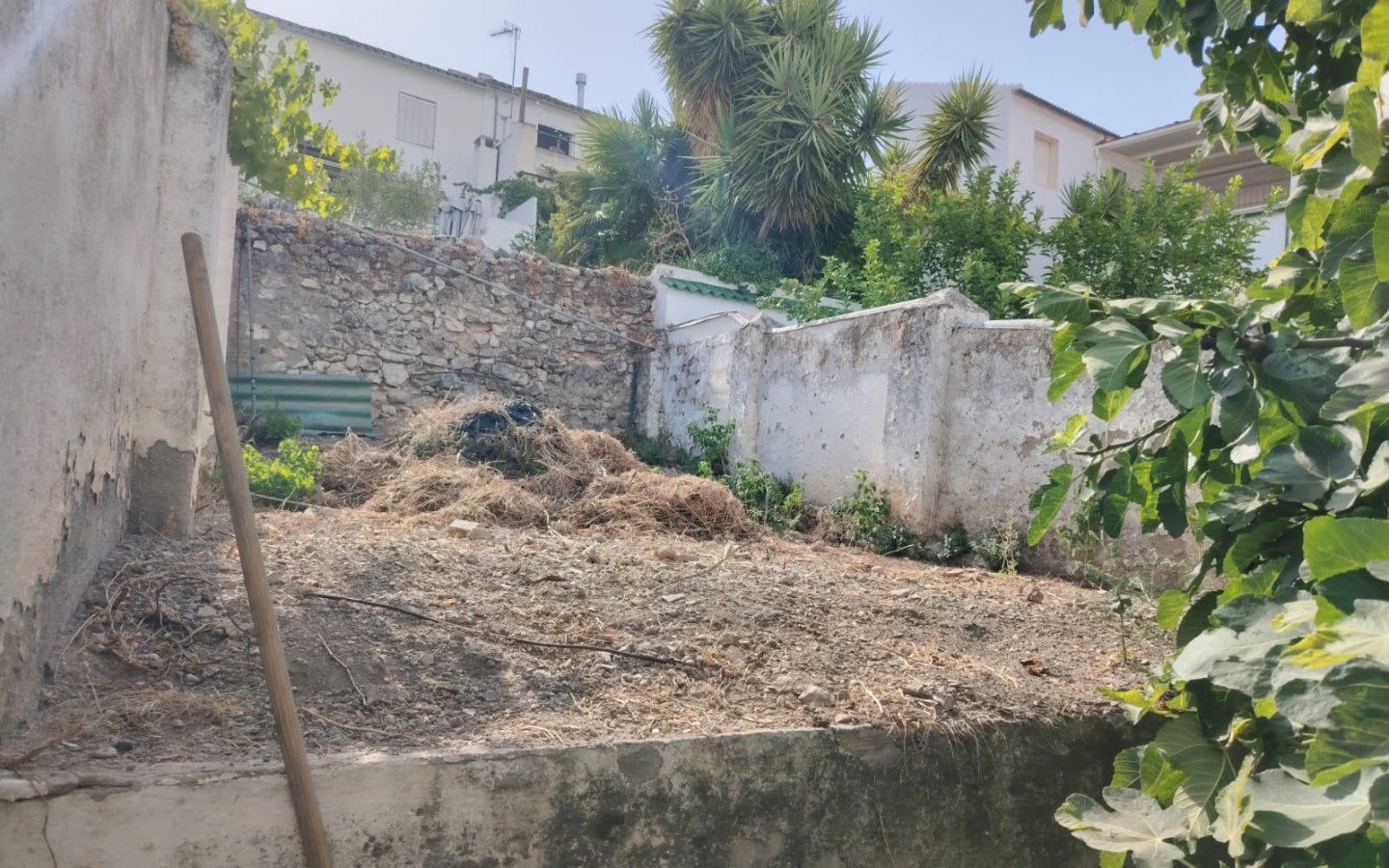 Set back from the road in a raised position there is an entrance hall leading into a reception room. To the front there is a large sitting room with an air conditioning unit. To the rear is a galley kitchen which has fitted wooden units and a beamed ceiling. Off the kitchen is a large room again with a beamed ceiling which would be an ideal dining room and it has a large rear view window. There is access from the kitchen out to the rear patio where there is a covered utility area, a shower room with wc and sink then a large outbuilding ideal for storage. A staircase then from the patio leads up to a large garden area ( currently overgrown) that has fig trees and other fruits. Tidied up this is a great area in a raised sunny position.
