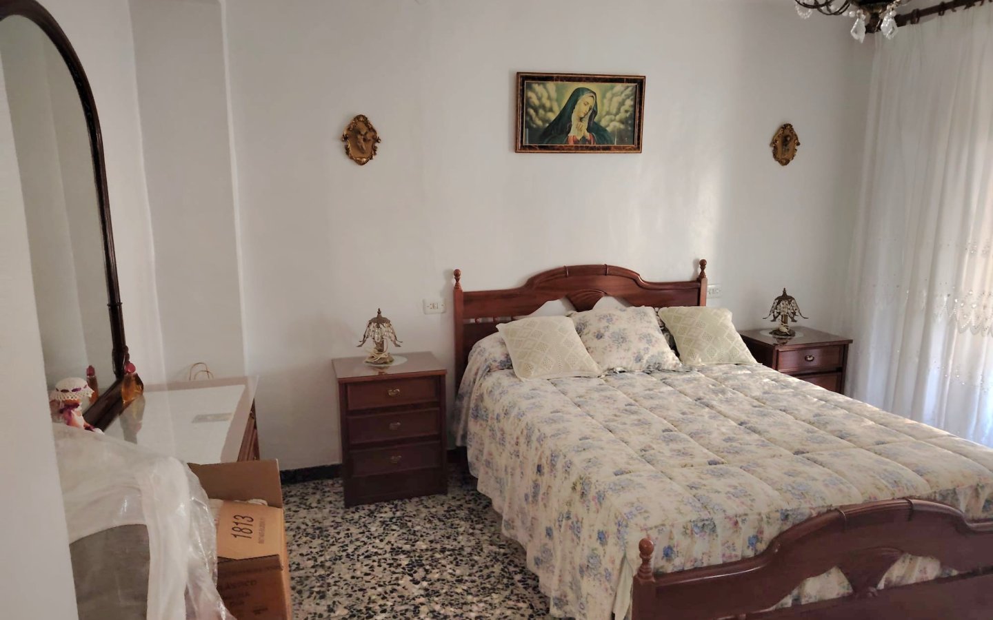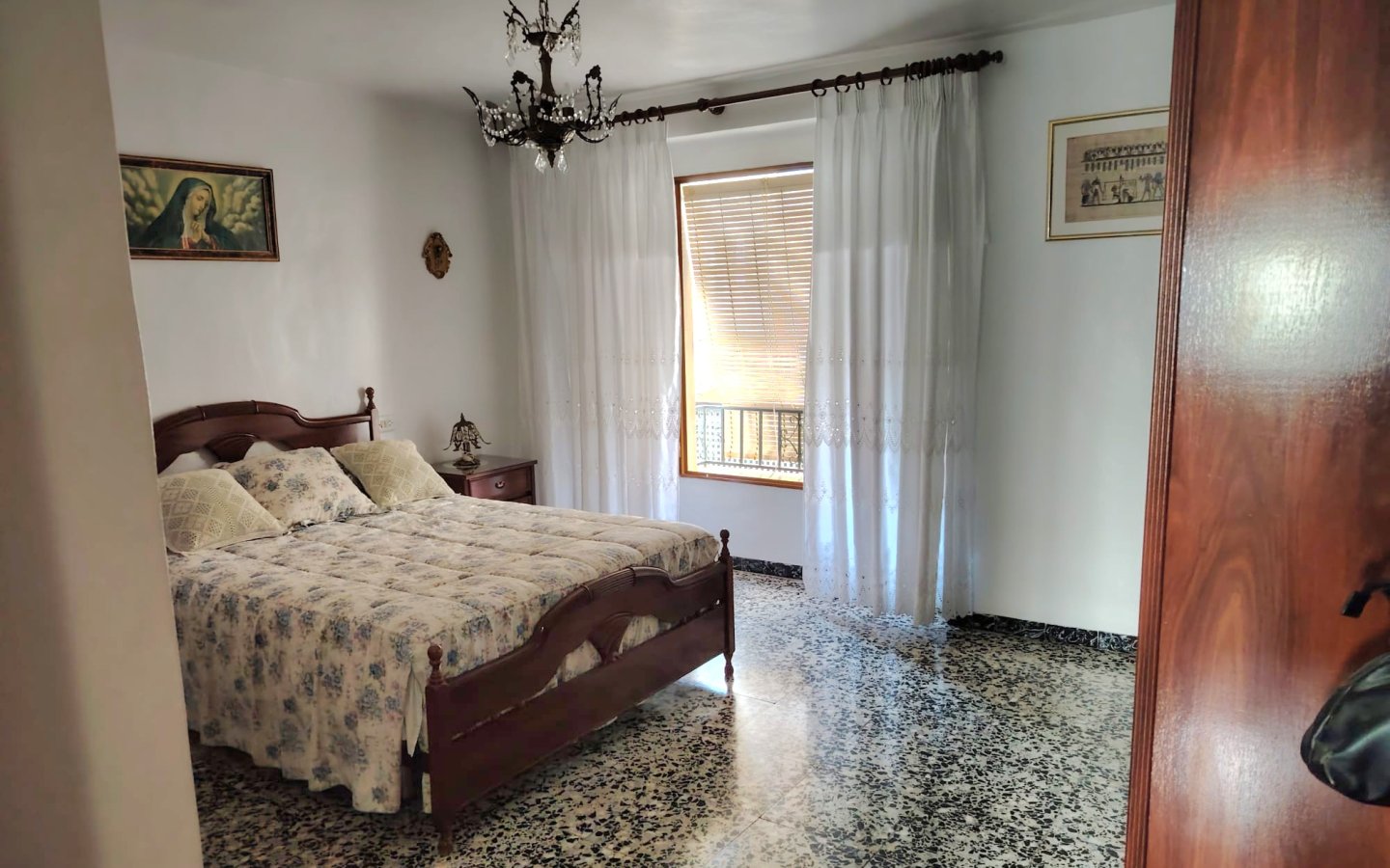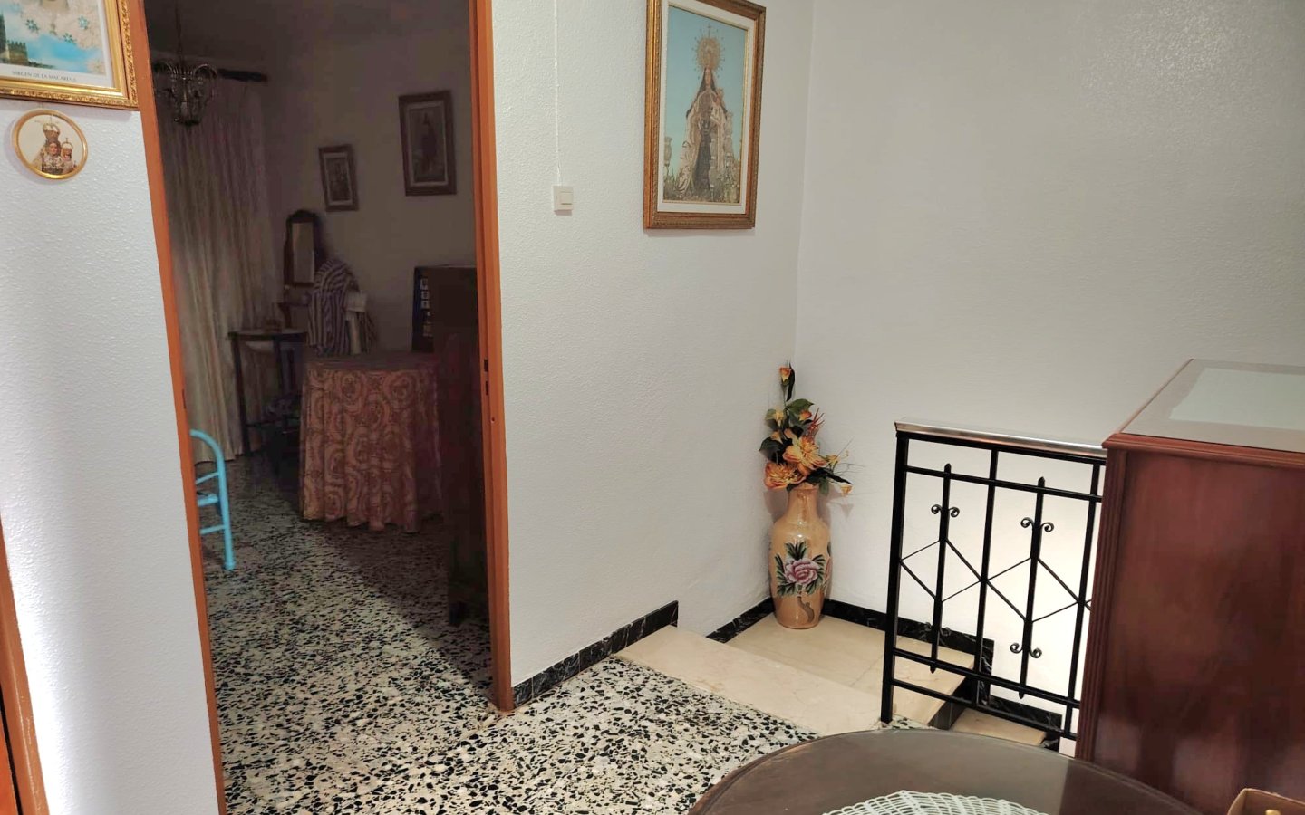 Inside here there is a staircase leading up to a large storage room then opposite access to a good sized raised sun terrace A marble staircase leads to the first floor fo the property where there is a large bright landing area then a bedroom ( currently being used for storage). There is then a large master bedroom that is front facing with a semi Juliette balcony. On this level there is also another large bedroom room which is rear facing and a family bathroom with a shower, wc, sink and bidet.