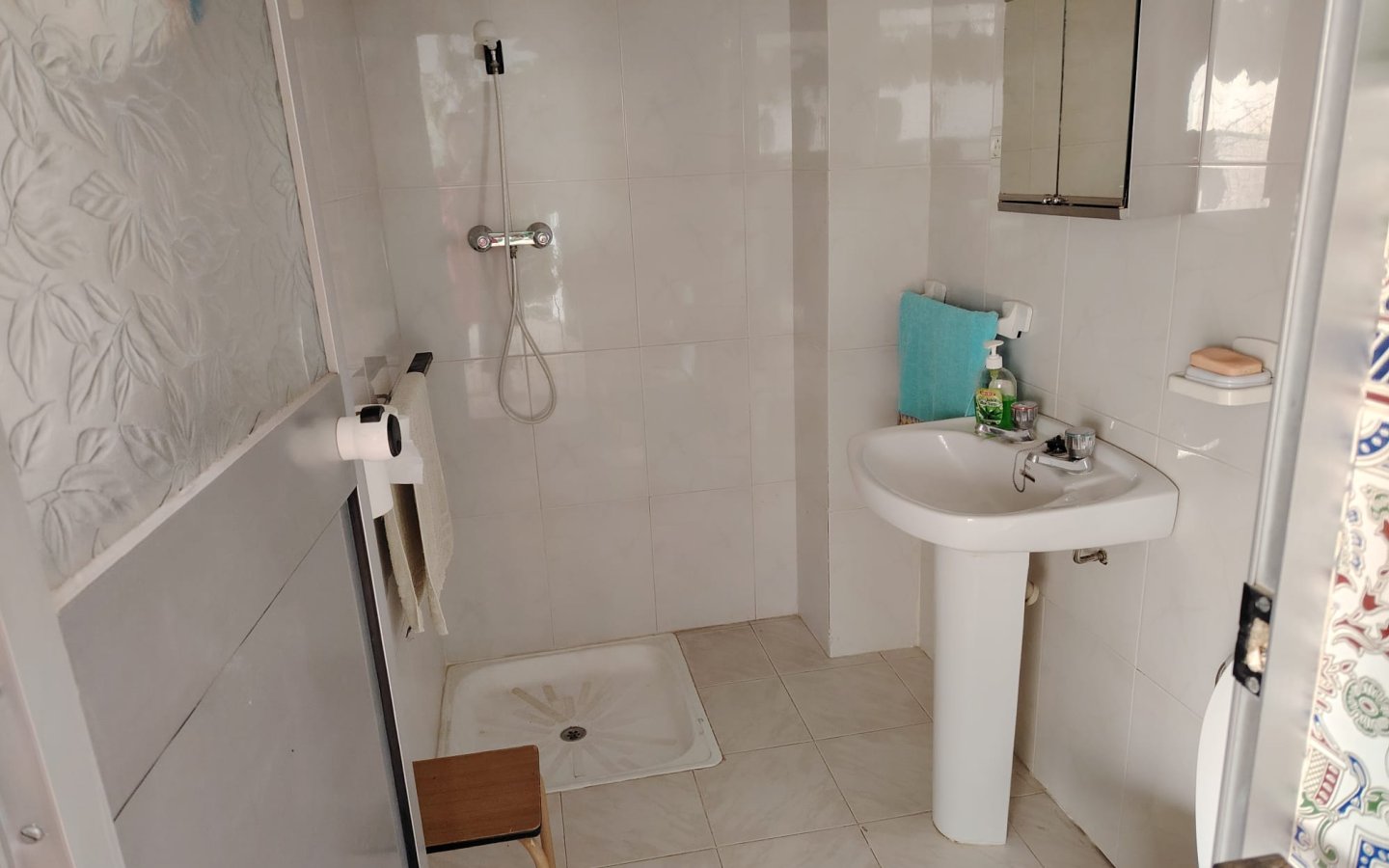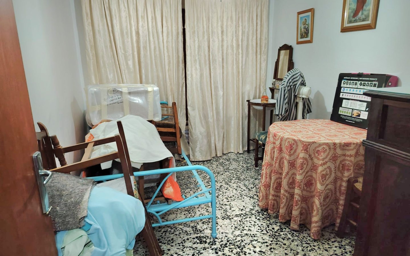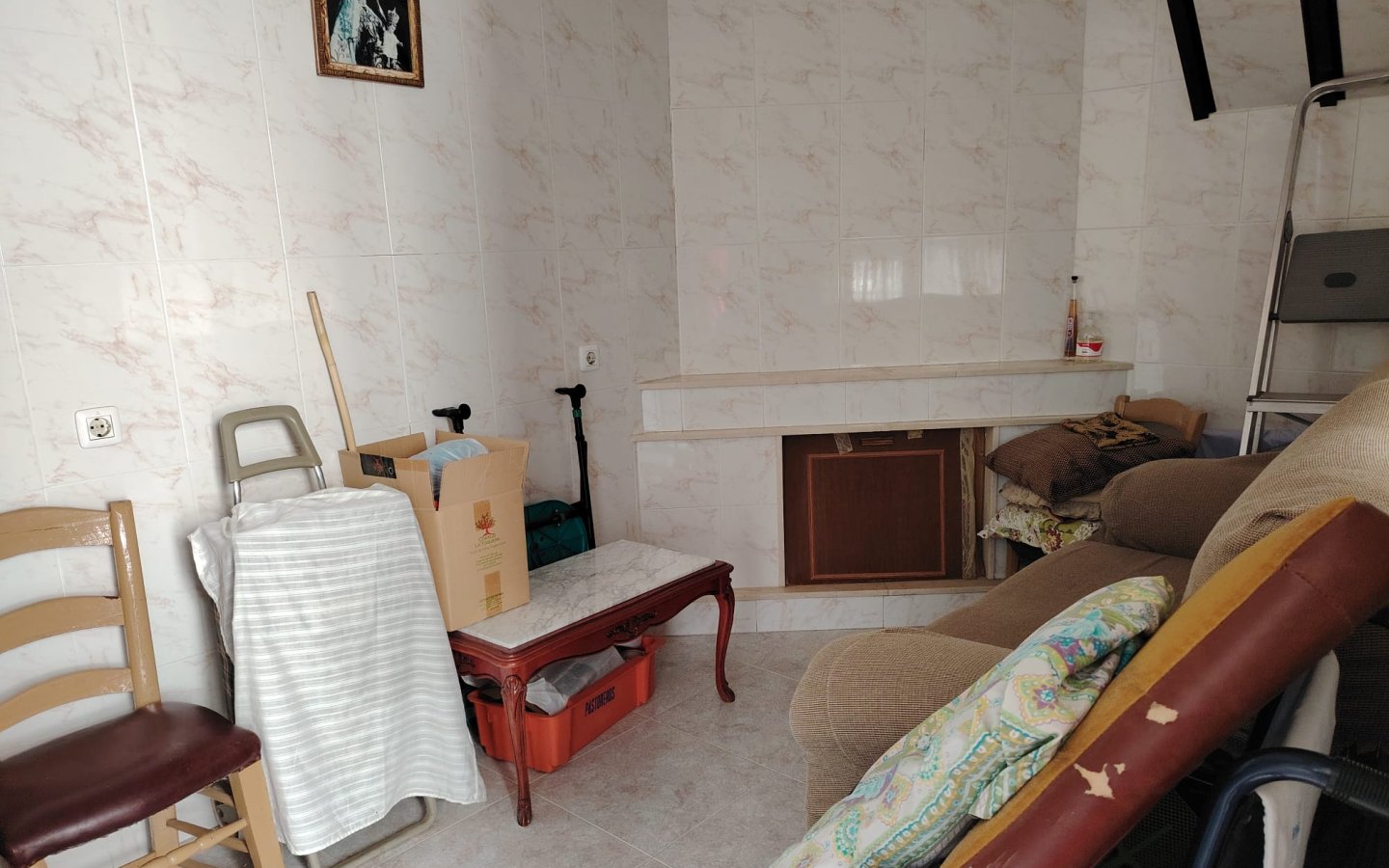 Inside here there is a staircase leading up to a large storage room then opposite access to a good sized raised sun terrace A marble staircase leads to the first floor fo the property where there is a large bright landing area then a bedroom ( currently being used for storage). There is then a large master bedroom that is front facing with a semi Juliette balcony. On this level there is also another large bedroom room which is rear facing and a family bathroom with a shower, wc, sink and bidet.
