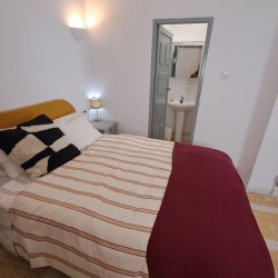 The first has a large light landing area leading to a large master bedroom with an open plan ensuite including a full bath, wc and sink . The room has lovely traditional beams on the ceiling and lots of light coming in from the windows with views to the mountains