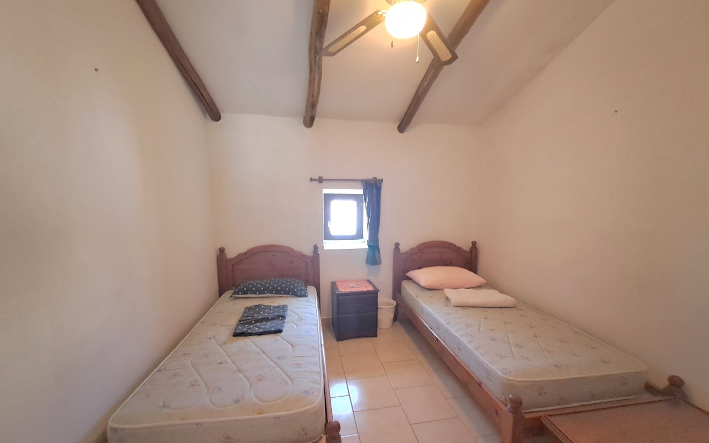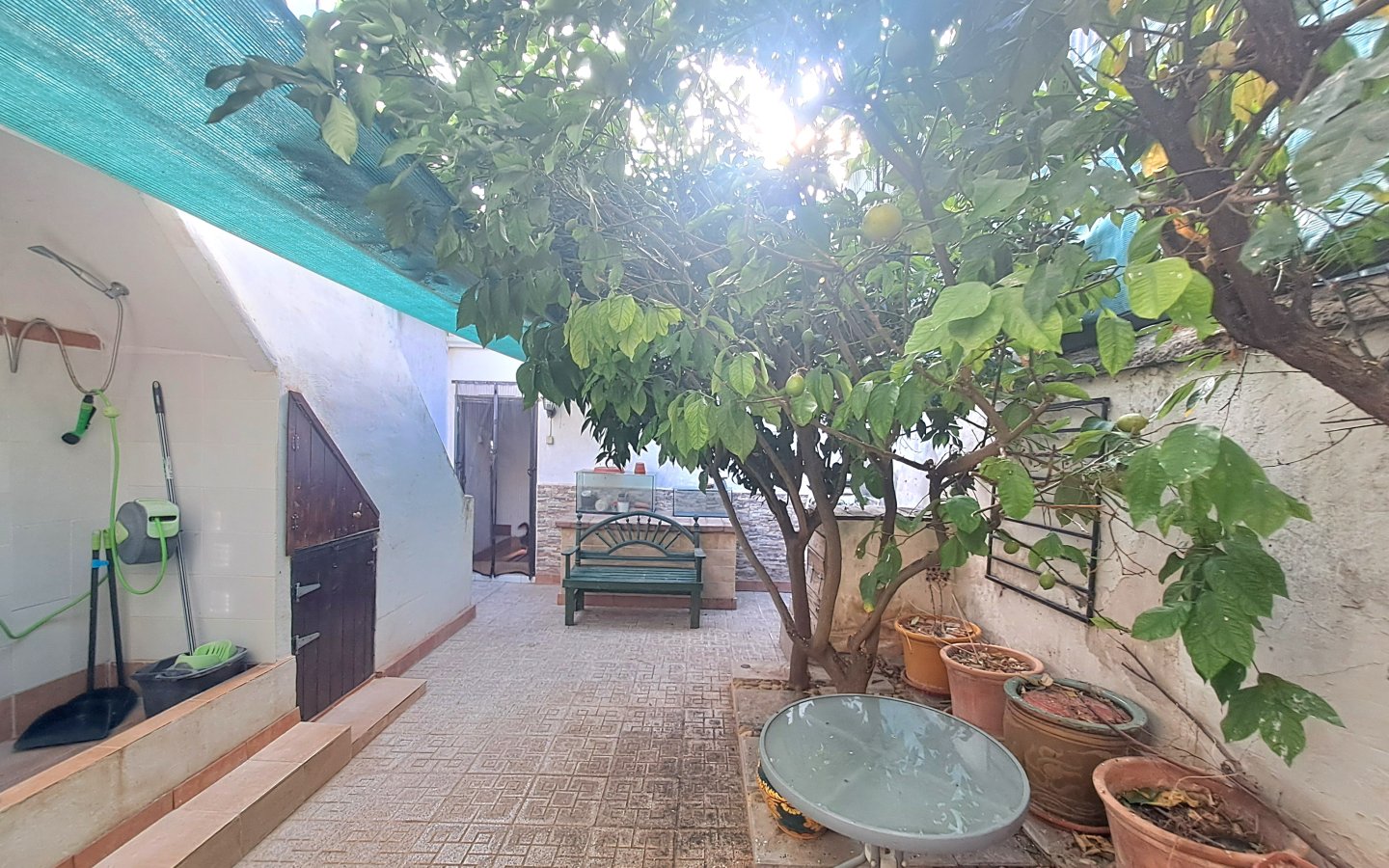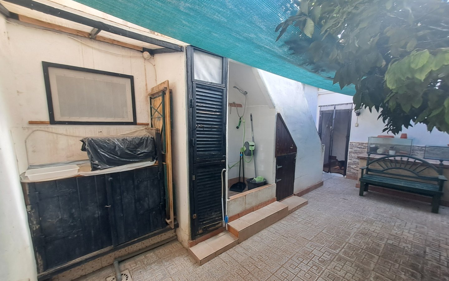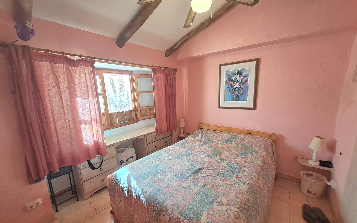 A staircase in this area leads to the first floor where there is a bright landing and hallway that leads to a front facing double bedroom ( currently set out as a twin) It has traditional beams on the ceiling, a ceiling fan and a built-in wardrobe. There is then a large rear facing family bathroom with a full bath, walk in shower, sink with a vanity unit, large walk in shower with a seat and wc with a handheld bidet. On this level there is also a huge master bedroom which is front facing with two windows, ceiling fan, beamed ceilings and wooden built-in wardrobes. There is then another double bedroom which is rear facing with a ceiling fan, beamed ceilings and built-in wardrobes. From the landing area there is access to a good sized raised terrace overlooking the courtyard. There are steps here too that lead down to the courtyard. This area also benefits from having a storage cupboard.
