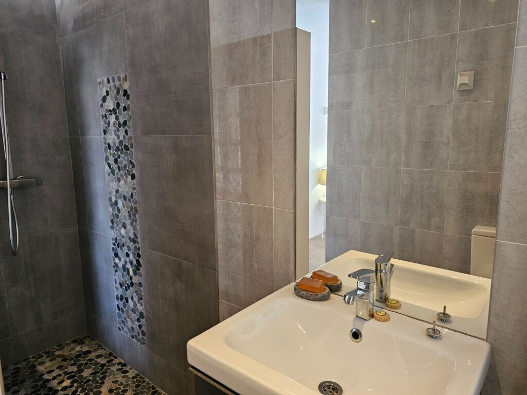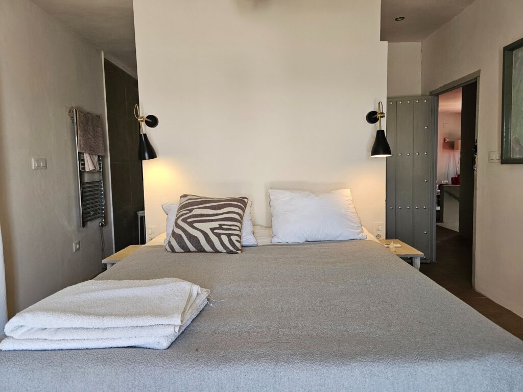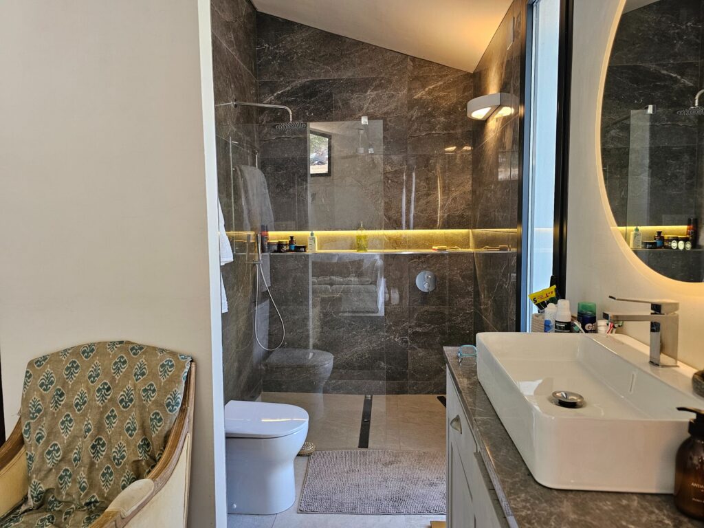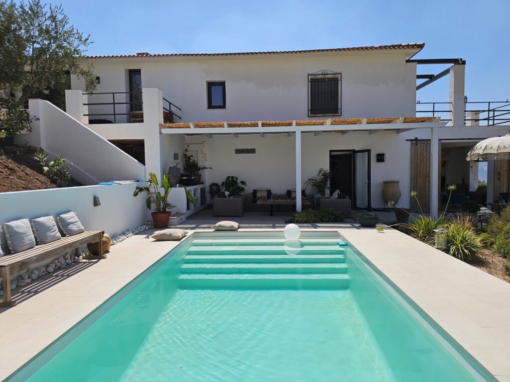 The house has a spacious dining area and big fully equipped kitchen, very useful for the lovely lunches the owners regularly organize for friends. They had the original idea to create a real outside living room with open windows, seating corners and even a fireplace; this is where they spend most of their time, enjoying the stunning views and lovely breeze. On the first floor, there are 3 spacious bedrooms with each their own en-suite bathroom and private terrace. The last renovated bedroom even has a bath-tub outside on the terrace, closer to nature you can’t be. There is floor heating and cooling on both of the floors working on a heating pump. In the cosy living room, there is an additional woodburner for cold winter days. A swimming pool of nearly 4 x 6 m provides pleasant refreshment.