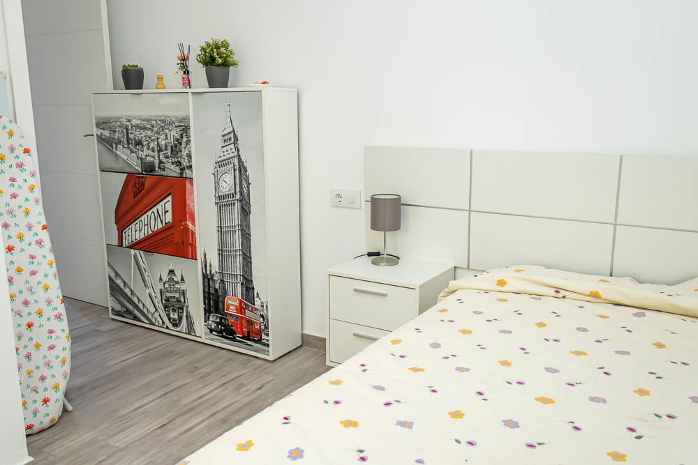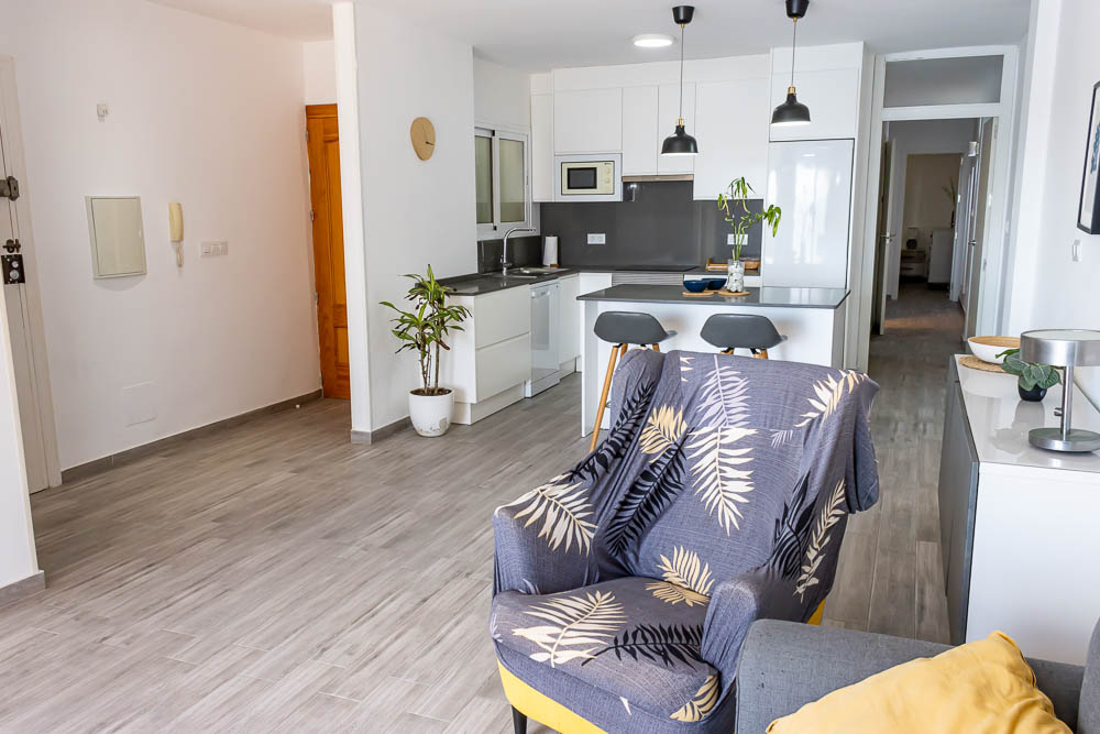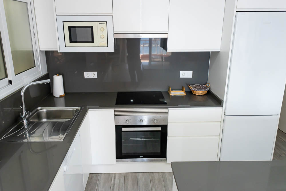 It has 108 m² of well-utilized living space, the layout has been designed to maximize natural light, enjoy the views, and create a comfortable and fluid lifestyle. The spacious and open-plan living and dining area features a seating area that opens through a sliding glass door onto the private terrace, offering panoramic views of the sea and the promenade. The dining area also has another window providing a direct view of the beach and flooding the space with natural light throughout much of the day. The open-plan kitchen, with a central island, is equipped with a Silestone countertop and modern finishes, ideal for those who value both design and functionality.